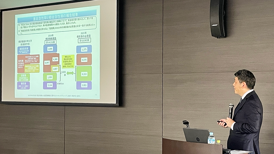 現在の医療の状況が厳しい環境であること、地域住民が幸せに生活できるように、地域の状況を知り何ができるかを考えることが大事であると話された。日本を取り巻く環境の概要・医療供給体制、令和6年度の診療報酬改定の内容の講義があり、在宅と病院等が連携できるICT[宇陀ケアネット]の事例紹介が興味深く心に残った。